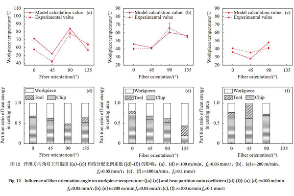 以T700碳纖維與聚醚醚酮(PEEK)復材制備而成的不同碳纖維角度板材的機加工數據為例,實驗結果顯示,在相同工藝條件下,纖維方向為90°和135°的板材傳入工件的熱分配比例系數和工件溫度明顯高于纖維方向為0°和45°的情況。另外,不論纖維方向如何變化,加工過程中傳入切屑和工件的熱分配比例始終大于傳入刀具的熱分配比例。切削速度和進給量對工件溫度有顯著影響,通常情況下,隨著切削速度的增加,工件溫度會先上升后下降,在切削速度約為v=100 m/min時達到峰值。
