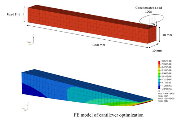 CFRTP的一個(gè)機(jī)械特性是楊氏模量(E1)與切向剪切模量(G13)的比值。這里面就是跟材料的低切向剪切有關(guān)系,并且在在進(jìn)行E1/G13的比率還跟纖維形態(tài)以及加熱條件有關(guān)系。在有限元分析中采用懸臂長(zhǎng)度L、寬度b和初始厚度t0被設(shè)置為100mm、10mm和10mm情況下。在邊界條件下,集中載荷P=100N作用于一個(gè)邊緣,另一個(gè)邊緣固定但可以在z方向上移動(dòng)以進(jìn)行自由形狀優(yōu)化過程。得出想要的結(jié)果,從而在產(chǎn)品設(shè)計(jì)階段,無論是做運(yùn)動(dòng)器材、汽車零件還是其他高科技產(chǎn)品,都能更好地利用這種材料的優(yōu)點(diǎn),做出既輕便又耐用的好東西。這里可以看下圖: