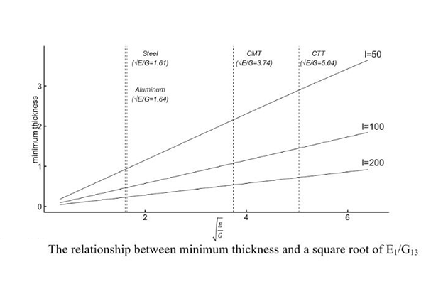 再進(jìn)行面外剪切模量的影響因素測(cè)試,面外剪切模量(G_shear)是衡量材料抵抗面外剪切變形能力的指標(biāo),對(duì)于理解CFRTP在彎曲條件下的行為至關(guān)重要。面外剪切變形會(huì)導(dǎo)致有效截面減小,進(jìn)而影響材料的承載能力和穩(wěn)定性。通過理論推導(dǎo)和實(shí)驗(yàn)驗(yàn)證,了解面外剪切模量如何影響CFRTP的彎曲剛度和強(qiáng)度,特別是在多層復(fù)合結(jié)構(gòu)中,各層間剪切應(yīng)力的傳遞效率直接關(guān)聯(lián)到整體結(jié)構(gòu)的性能。這里可以看下圖跟鋼材鋁的對(duì)比,其中CTT和CTM均是連續(xù)碳纖維熱塑性復(fù)合材料,表現(xiàn)出了不俗的性能優(yōu)勢(shì)。這里研究的意義在于,產(chǎn)品在需要彎曲變形狀態(tài)下依然有非常好性能,相較于鋼材,CFRTP材料就可以更好的實(shí)現(xiàn)想要的效果,有能夠更好的完成產(chǎn)品制作。