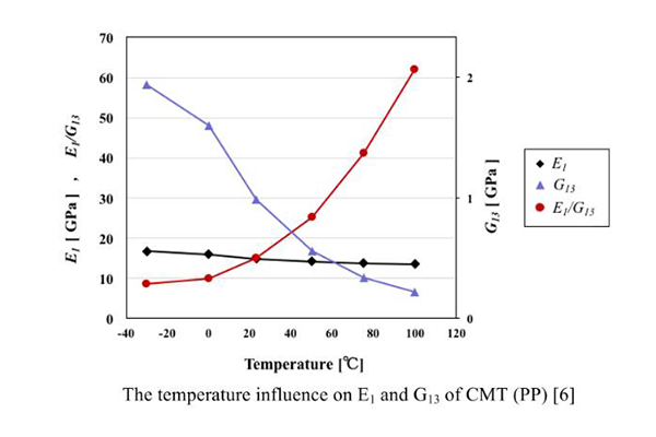 另外在特殊的領(lǐng)域中,還需要考慮到不同溫度下的性能表現(xiàn),那隨著溫度升高,CFRTP的楊氏模量(E1)與切向剪切模量(G13)都會(huì)降低,但G13的降低速度更快,因此在高溫情況下,CFRTP產(chǎn)品具備更好的安全系數(shù)。