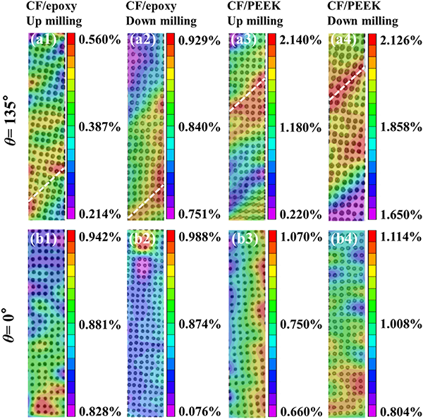 通過數(shù)字圖像相關(guān)(DIC)方法,研究了兩種材料在拉伸測(cè)試期間的全場應(yīng)變分布。CF/PEEK顯示出沿纖維方向更為均勻的應(yīng)變分布,這歸因于PEEK基體的韌性,使其能夠承受更大的拉伸載荷。在纖維切割角度為135°時(shí),最大應(yīng)變出現(xiàn)在試樣邊緣,與銑削損傷(如撕裂和毛刺)引起的應(yīng)力集中相關(guān)聯(lián)。