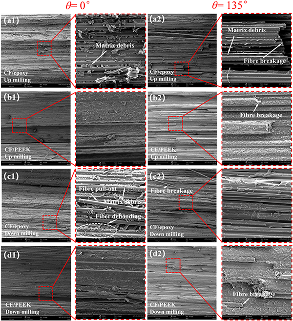 通過掃描電子顯微鏡(SEM)觀察兩種復(fù)合材料的斷裂表面,可以進(jìn)一步理解其斷裂機(jī)制。CF/PEEK的斷裂表面呈現(xiàn)出較為平滑的形態(tài),這表明PEEK基體能夠更好地承受拉伸載荷并保持纖維的完整性。相比之下,CF/環(huán)氧樹脂的斷裂表面顯示出更多的基體碎片和纖維拉拔缺陷,表明其界面結(jié)合強度較弱,更容易發(fā)生面內(nèi)復(fù)合損傷。