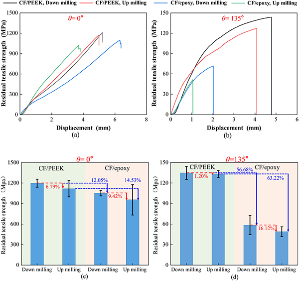 CF/PEEK復(fù)合材料展現(xiàn)出顯著更高的殘余拉伸強度,與CF/環(huán)氧樹脂相比,提升幅度在12.05%至63.22%之間。這種性能的提升主要歸因于PEEK基體與碳纖維之間的牢固界面結(jié)合,以及PEEK基體在拉伸過程中發(fā)生的塑性變形能力。這些因素共同作用,減少了纖維的斷裂和脫粘,從而降低了表面損傷,最終提高了材料的整體殘余拉伸強度。