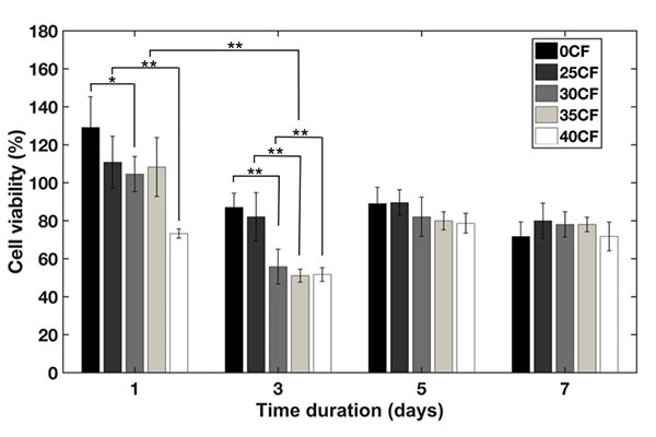 除了力學性能織物,CF-PEEK復合材料的細胞毒性也是評估其作為植入材料可行性的重要因素。無論是短切碳纖維還是長碳纖維增強的PEEK復合材料,其細胞毒性水平都非常低,屬于輕微毒性。細胞存活率在75%-100%之間,這表明PEEK及CF-PEEK復合材料具有良好的生物相容性。在進行倒置熒光顯微鏡觀察到的細胞形態也證實了這一點:在培養1天、3天、5天和7天后,細胞仍然保持著飽滿的狀態,沒有明顯的萎縮或死亡現象。