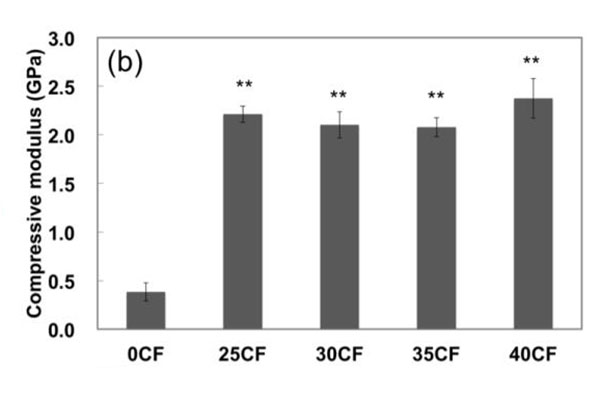 碳纖維作為一種高性能的增強材料,其在PEEK基體中的引入顯著提升了復合材料的機械性能,這里從下圖來看。當碳纖維含量增加時,CF-PEEK復合材料的力學性能隨之提高。如含有30%碳纖維的CFR-PEEK復合材料,其硬度和模量均大于純PEEK。特別值得一提的是,65%碳纖維含量的CFR-PEEK復合材料,其橫向壓縮強度達到了185.69 MPa,接近人骨的壓縮強度(約208.2 MPa),遠高于純PEEK的136.9 MPa。這表明通過調整碳纖維的含量,可以有效改變復合材料的力學性能,使之更適合于作為骨科植入物使用。