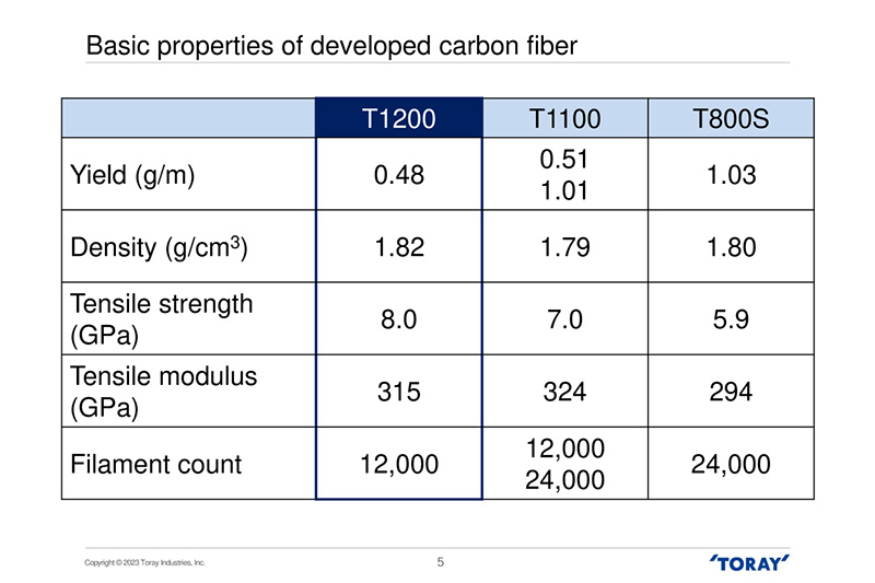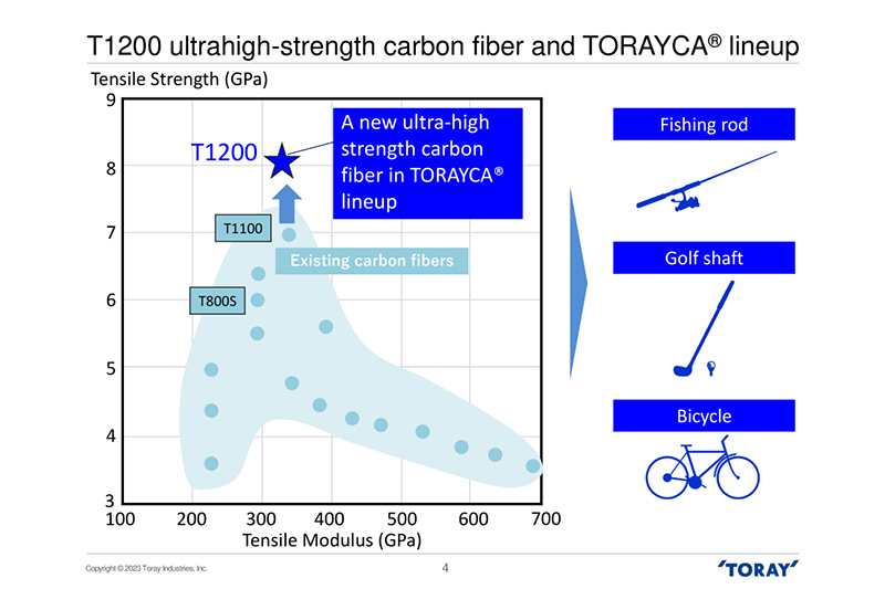 TORAYCA™ T1200為12K小絲束產品,拉伸強度為8.0千兆帕斯卡(或GPa,約為每平方毫米100千克力)。這比 TORAYCA™ T1100 的 7.0 高出 10% 以上。后者是目前拉伸強度最高的。其廣泛的應用包括高爾夫球桿、自行車配件、釣魚竿以及其他運動、休閑設備、賽車運動以及航空和航天。