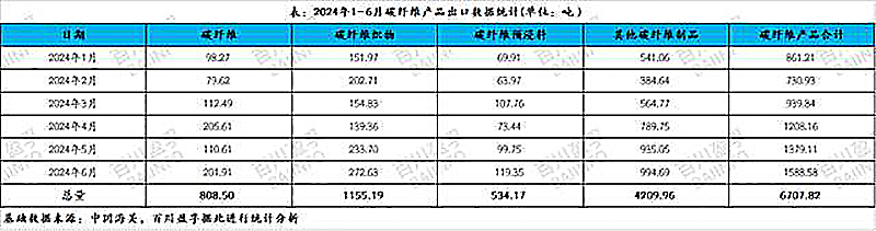 2024年6月我國進口碳纖維699.24噸,進口碳纖維織物67.78噸,進口碳纖維預浸料166.93噸,進口其他碳纖維制品685.03噸,進口碳纖維產品合計1618.99噸。