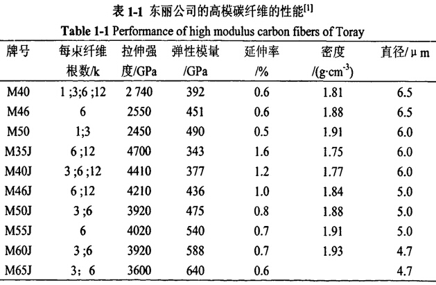 從上圖可知,PAN基高模碳纖維的性能與PAN基高強碳纖維的性能具有一定的差距。從M40到M50碳纖維的拉伸強度略有降低,但彈性模量大大提高;而從M35J到M65J碳纖維的強度雖然也略有降低,但相比于M系列已經大大提高了,彈性模量從343GPa增加到640GPa,增長了將近一倍,纖維的直徑也在趨于細旦化,從6.5μm降低到了4.7μm。T300到T1000G強度提高了近一倍,而模量提高的幅度很小,強度最高的T1000G的模量值也僅達到了294GPa。